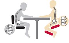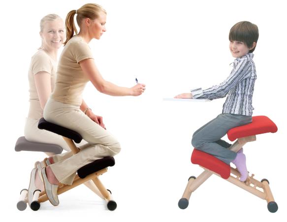 デスクあるいはテーブルにて : 膝をつき、背筋を伸ばした姿勢をとることで、身体にとってもっとも適した自然なカーブが生まれます。呼吸の量は上がり、脊椎骨の圧迫は最小になります。 | |||